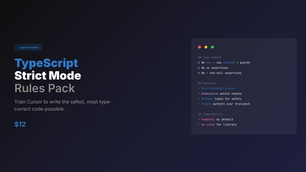 Drop one .cursorrules file into your project root. Cursor immediately writes strict, production-safe TypeScript.